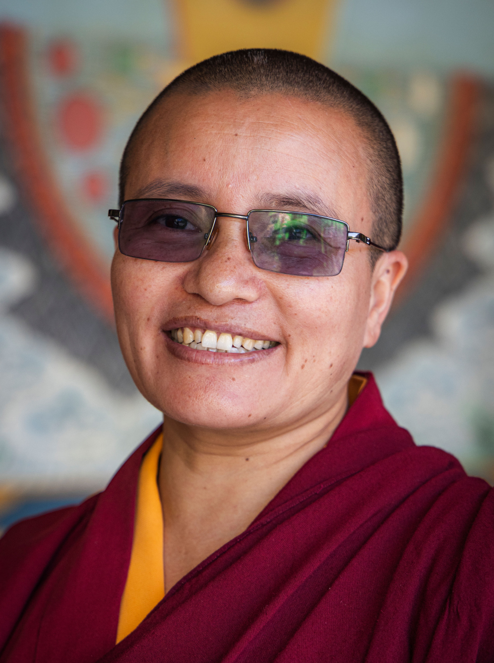 Ani Dechen Palmo (Glorious Great Bliss Lady) is from Bhutan. Her family farmed, and she has four brothers and four sisters. Unfortunately her father has died. When she was in eighth grade, her brother died, and Ani Dechen Palmo decided then she would become a nun. She is the administrative dynamo of Tek Chok Ling, answering emails, helping everything to run smoothly and assisting visitors with her fluent English. She also teaches the other nuns and does translating and transcription of Rinpoche’s teachings. She especially likes cooking for Rinpoche (her sister is Thinley Palmo, Rinpoche’s main cook.) She likes hearing the teachings in English and has memorized dharma texts and songs in English. She also likes to meditate, and practices drawing mandalas. Every day for Ani Dechen Palmo is one of non-stop service to Tek Chok Ling, Rinpoche and her fellow nuns.
